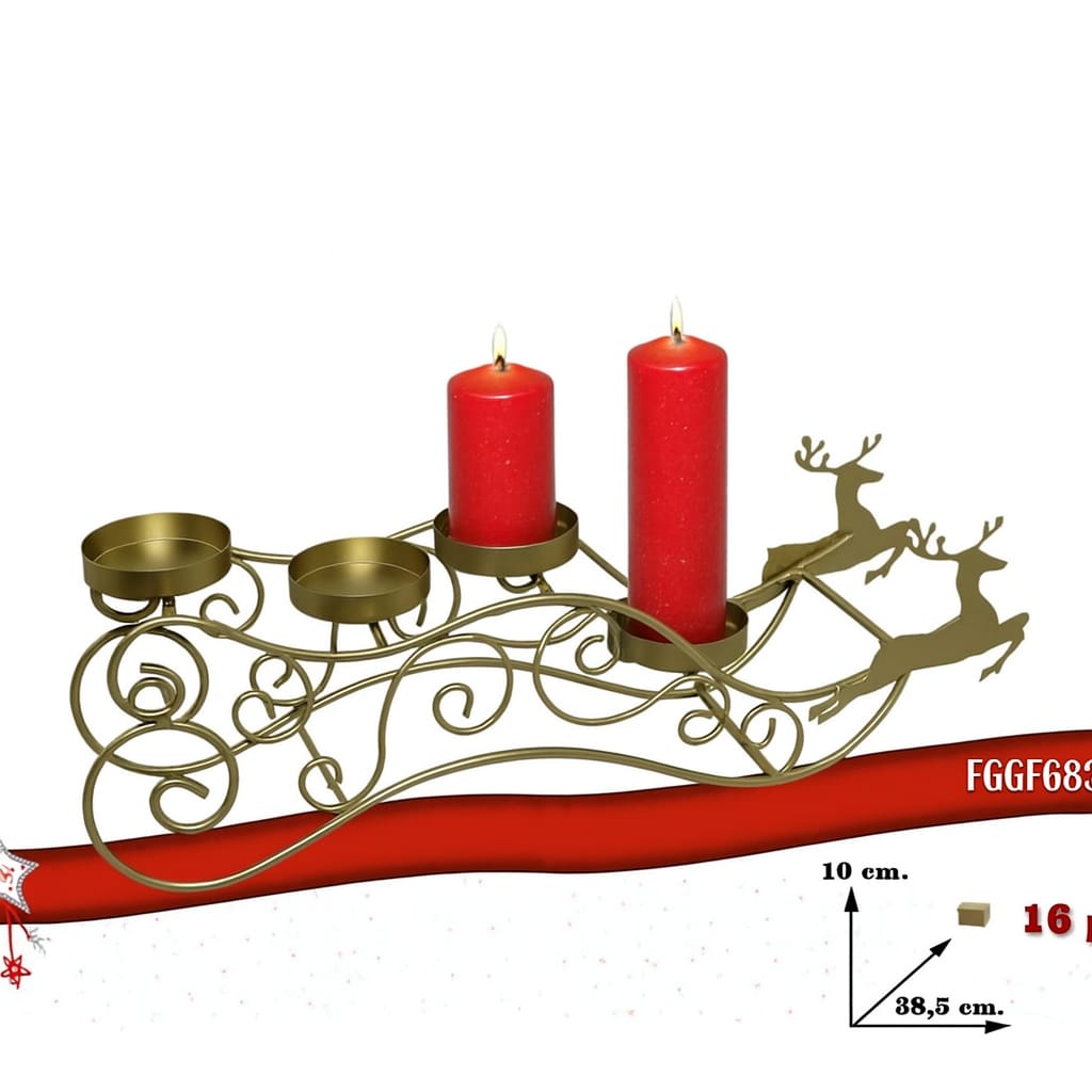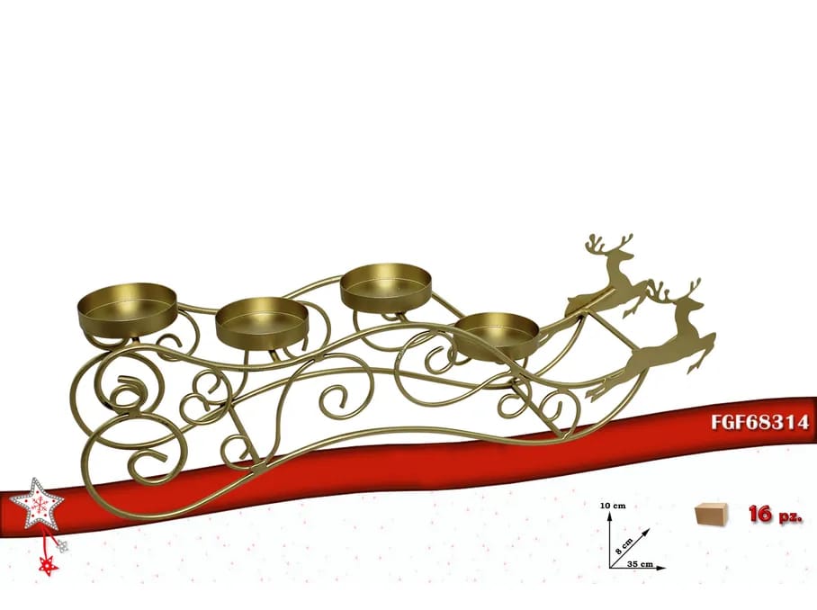 Questo elegante portacandele natalizio in metallo dorato è progettato a forma di slitta di Babbo Natale trainata da due renne. La struttura è realizzata con linee sinuose e decorative che richiamano motivi festivi e raffinati, rendendolo un perfetto centrotavola per le decorazioni di Natale.